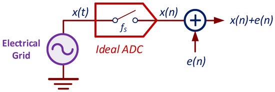 Considering σT, an equivalent statistical representation in Figure 5 models the XADC. Here, the input signal, x(t), is sampled at a frequency, fs (1 MHz) and the noise, e(n), is an uncorrelated random Gaussian distribution variable with a standard deviation σT = 529.7 μV. Indeed, the amplitude of the emulated grid voltage including the noise can be expressed as Vg = 230√2 ± 0.38 V.