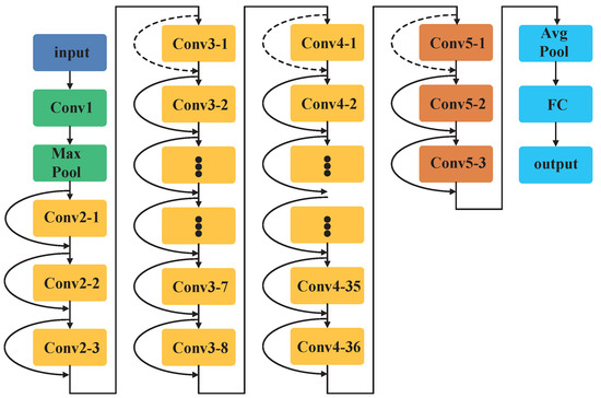 The image size of the training data set is 224 × 224, and the backbone network adopts the ResNet series network structure. Figure 2 shows the local structure. The constant mapping in the ResNet structure can solve the vanishing gradient problem and model degradation during the parameter learning process. In this study, the SAR and ImageNet datasets are used to train the front and middle sections of ResNet152, respectively. The ResNet152 network consists of multiple 3 × 3 and 1 × 1 convolution kernels. The former kernel unit extracts the features of the image information, and the latter kernel can upgrade and reduce the dimensionality of the feature channel through the integration of cross-channel features. Figure 3 shows the ResNet152 network structure diagram.
