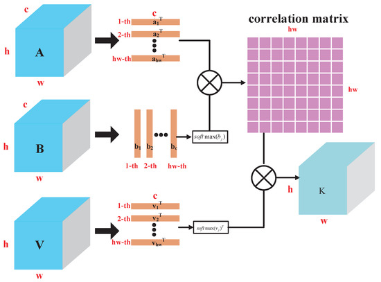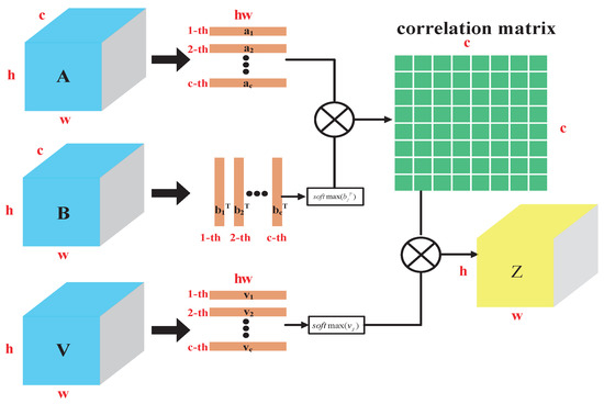 where , and are the corresponding network parameters. The layers and V are expanded in the spatial dimension, where and . In order to calculate the channel attention factor, this paper uses the matrix product to calculate the channel correlation matrix , which is described as