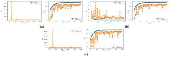 SSS target recognition results of ResNet series networks: (a) ResNet50 loss and accuracy curves; (b) ResNet101 loss and accuracy curves; (c) ResNet152 loss and accuracy curves.