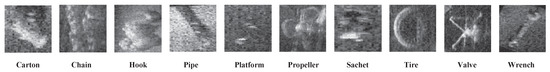 The method proposed in this paper can not only recognize SSS targets but can also be applied to FLS target recognition. In order to verify the effectiveness of the proposed method with respect to a higher number of target recognition categories, this paper uses Forward Looking Sonar (FLS) data for experiments. Among them, the total number of samples is 3192, the number of target categories is 10, the number of training sets is 2231, and the number of test sets is 961. Figure 15 shows the data sample diagram and Table 8 shows the experimental results.