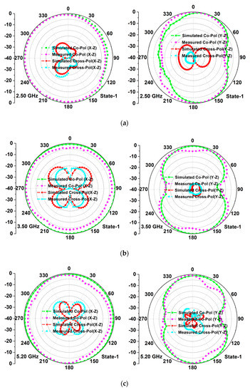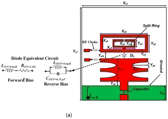 In the next step, an SRR is loaded into the upper patch of antenna-4, shown in Figure 2e, resulting in dual-band operation (antenna-5) at 3.30 GHz and 4.60 GHz. Then, a 1 mm × 1 mm metal strip is embedded between the lower and upper patches, resulting in the development of antenna-6, shown in Figure 2f. The antenna-6 resonates at 2.50 GHz, 3.50 GHz, and 5.20 GHz. The metal strip is used as an RF PIN diode to switch the operating states of the antenna elements. When diodes are in the OFF state, the antenna element function as antenna-5 with two operating bands, while in the ON state, it functions as antenna-6 with three operating bands.