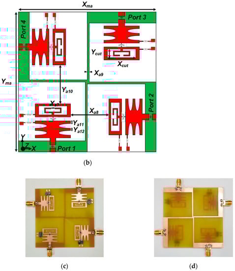 Schematic: (a) Antenna element; (b) MIMO antenna; (c) Top side of the antenna prototype; (d) Back side of the antenna prototype.
