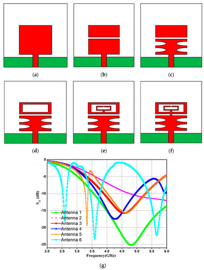Development of the antenna element: (a) Antenna-1; (b) Antenna-2; (c) Antenna-3; (d) Antenna-4; (e) Antenna-5; (f) Antenna-6; (g) Scattering parameters of the design stages.