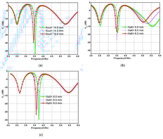 The parametric analysis of the antenna element is shown in Figure 3. When performing parametric analysis, when Xcut is changed from 14 to 15 mm in 0.5 mm steps, the frequency of 3.5 GHz changes, as shown in Figure 3a, whereas when Xa6 changes from 5.5 to 6.5 mm in 0.5 mm steps, the upper band changes, as illustrated in Figure 3b. Similarly, when Xa5 changes from 8.0 to 9.0 mm, the center band changes, as illustrated in Figure 3c. Consequently, the optimum values of Xcut, Xa6, and Xa5 are considered 14.5 mm, 6.0 mm, and 8.5 mm, respectively.