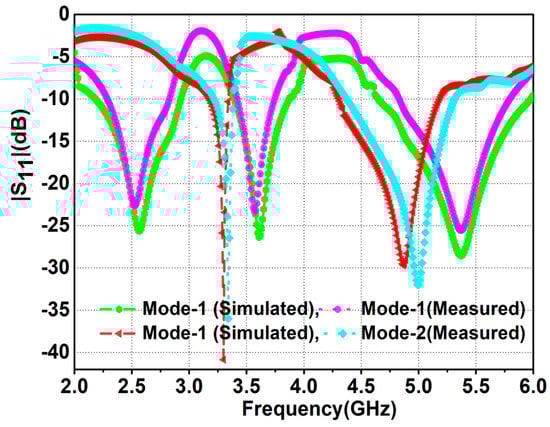 Figure 6 depicts the simulated and measured scattering attributes of the MIMO antenna design for the working states. During simulation, the PIN diode (BAP64-02 NXP) is modeled with metal strips by assigning different RLC boundary conditions for modes-1 and -2. A 20 pF DC blocking capacitor and a 22 nH inductor are used to separate biasing and excitation supply (DC/RF). Also, the biasing lines are printed in such a way that their influence on resonator performance is minimized. The small metal pads of 1 mm × 1 mm are used for the biasing circuit. The PNA-L series vector network analyzer is used for the measurement of reflection coefficients, which are plotted in Figure 6. A very small difference between experimental and simulated outcomes is seen, which is due to fabrication tolerance and SMD device pasting. Table 2 presents a summary of the simulated and measured results.