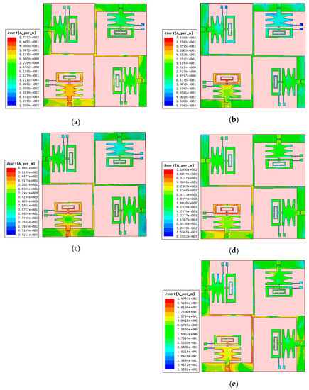 Simulated current flow for modes-1 and -2: (a) 2.50 GHz/mode-1; (b) 3.50 GHz/mode-1; (c) 5.20 GHz/mode-1; (d) 3.30 GHz/mode-2; (e) 4.70 GHz/mode-2.