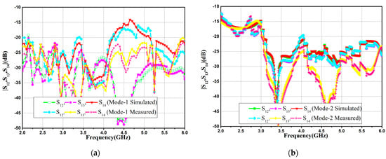 Scattering parameters of the MIMO antenna: (a) Mode-1; (b) Mode-2.