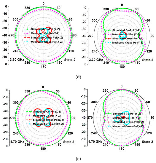Radiation plots of the developed MIMO antenna: (a) 2.50 GHz; (b) 3.50 GHz; (c) 5.20 GHz; (d) 3.30 GHz; (e) 4.70 GHz.