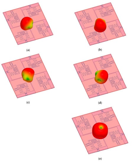 Polar plots of the developed MIMO antenna when: (a) port-1 is in the ON state; (b) port-2 is in the ON state; (c) port-3 is in the ON state; (d) port-4 is in the ON state; (e) ports-1 to -4 are in the ON state.
