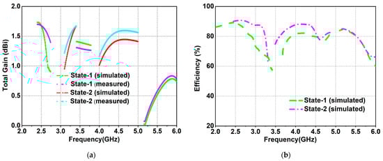 (a) The gain plot of the MIMO antenna; (b) Efficiency of the MIMO antenna.