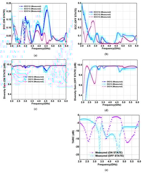 Performance of the MIMO/diversity attributes for modes-1 and -2: (a) ECC (ON state); (b) ECC (OFF state); (c) DG (ON state); (d) DG (OFF state); (e) TARC.