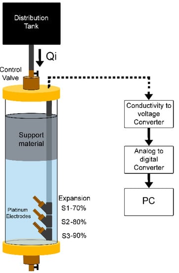 Figure 1 shows the block diagram of the bed expansion monitoring system. The expansion of the bed is produced by the flow generated by opening the control valve connected to the distribution tank. The flow is proportional to the valve opening and also dependent on the force of gravity. By circulating the fluid downward, the colonized bed, which has a lower conductivity than the effluent, begins to gradually expand.