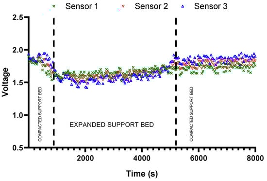 Figure 2 shows the results obtained from the dynamic expansion test of the support bed. This test consisted of introducing colonized support media recirculating in the reactor at a downward velocity of 1.41 m/h. It can be observed how after 650 s (10 min), sensor 1 detects a voltage decrease, which means that it has come into contact with the colonized support media; then, at 950 s (16 min), sensor 2 also comes into contact with the substrate, so its voltage decreases. Finally, sensor 3 comes into contact with the expanded support at 1230 s (20 min). After half an hour of operation, the recirculation is turned off, so the voltage values of the sensors begin to increase, but in reverse order, i.e., the voltage first increases in sensor 3, then in sensor 2, and finally, sensor 1 returns to its initial values.