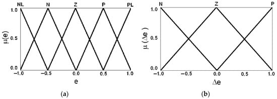 The membership functions for the inputs e and ∆e are defined in the range (−1, 1), see Figure 4a,b, respectively. The fuzzy subsets are defined as follows: NL: negative large; N: negative; Z: zero; P: positive; and PL: positive large, for the input e. N: negative; Z: zero; and P: positive; for the input ∆e.