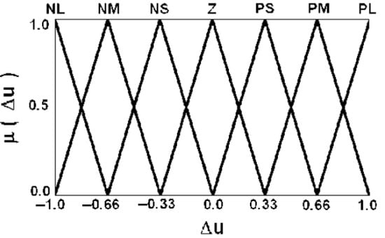 The membership functions for the output ∆u are defined in the range (−1, 1), see Figure 5. The fuzzy subsets for the output ∆u are defined as follows: NL: negative large; NM: negative medium; NS: negative small; Z: zero; PS: positive small; PM: positive medium; PL: positive large; for the output ∆u.