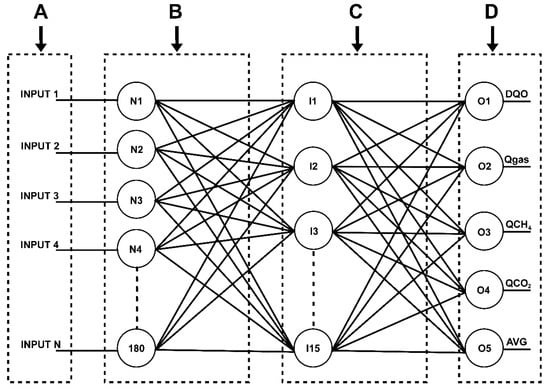 Figure 6 shows how the neural network was trained from the results obtained from the experimental tests performed with the bioreactor. The values of pH, COD concentration of the influent, inflow to the bioreactor and the signal coming from each of the conductivity sensors installed inside the reactor, during each of the experiments performed with the bioreactor, correspond to the input vector (A) of the neural network. This input vector contains 180 data points corresponding to the pH values, COD concentration of the influent, inflow to the bioreactor and the signal coming from each of the conductivity sensors installed inside the reactor during 6 months of experimental tests. There are 180 input neurons (B), which are connected to the neurons of the intermediate layer (C), and these neurons of the intermediate layer are connected to the output neurons (D), which generate the output signals estimated by the neural network, corresponding to the COD concentration of the effluent, the biogas production flow rate of the bioreactor (the sum of methane and carbon dioxide production), the methane production flow rate, the carbon dioxide production flow rate and the concentration of volatile fatty acids in the reactor effluent.