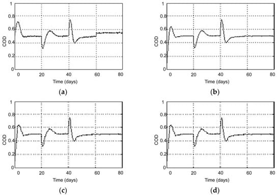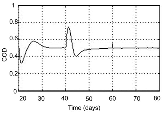 Figure 13 shows the graphs of the COD concentration in the influent, both the experimentally obtained graph and the graphs estimated by asymptotic observers 2 and 3. In this figure, it can be seen that the three graphs are practically identical until day 60 of the experiment, when the sudden and permanent failure of sensor s1 is observed. In Figure 14, a transient is observed on day 60 of the experiment. This transient corresponds to the action of the condition-based maintenance scheme, whereby the signal from sensor s1 is switched by its estimate generated by observer 2, so that the controller continues to operate normally and continues to regulate the COD concentration in the reactor effluent to 0.5 g COD/L.