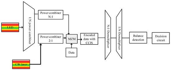 The DPS code has a feature of chip arrangements that are separated from one another at a regular distance. This feature, fortunately, matches with the CCIS design in which two blocks are proposed; the first block contains p that represents the number of bits “1s” having a length of p2 which is encoded via the LED and the remaining block comprises only bit “1” having a length of p that is assigned to the laser, as shown in Figure 1. The ultimate goal of the receiving section is to detect and recover the desired spectrum with a high autocorrelation and a low cross-correlation between the desired and interfering subscribers. Figure 3 shows a block diagram of the CCIS network where the incoming signal from the laser always passes without a subtraction process. In contrast, the signal coming from a sliced LED always needs subtraction since an MAI always resides in the LED portion. The detection arrangement at the receiving end is also configured to recover the entire encoded spectrum (containing both the LED and laser diode spectrums) in an attempt to yield maximum autocorrelation (equal to the weight of the code) and minimum cross-correlation. The output of the detector arrangement is sent to a photodiode for optical/electrical conversion and decision-making circuitry, respectively. The decision-making circuit computes the probability density function (PDF) of the received current with a certain threshold value to determine binary ‘1’ or ‘0’. If the system encounters nonlinearities, such as four-wave mixing (FWM), dispersion, and cross-phase modulation (XPM), then an optical source that trades off all the advantages of coherent and incoherent sources is utilized. The mechanism could be achieved by merging both the coherent and incoherent sources all at once.