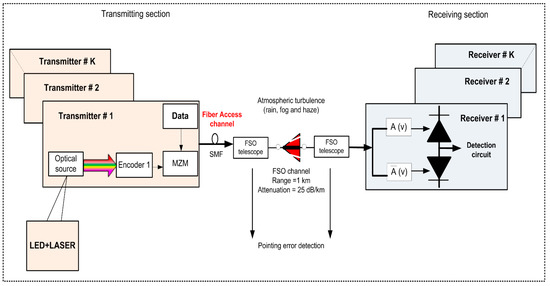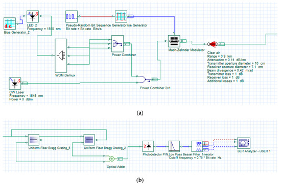 The avalanche photodiode (APD) is used in the complementary subtraction detection technique and the LPF is used in the receiver part of SS2 propagation, as shown in Figure 14b. The parameters of the FSO system are set according to typical industry values in order to simulate a real-world environment as closely as possible. Table 5 indicates the parameters that are used in the FSO channel [25,26].