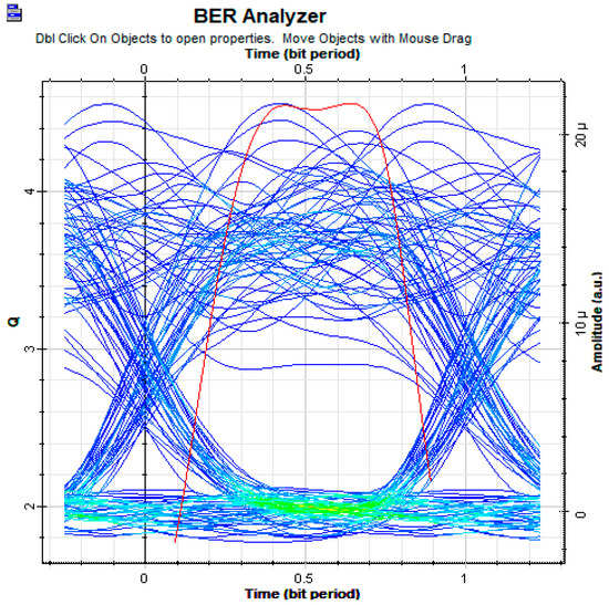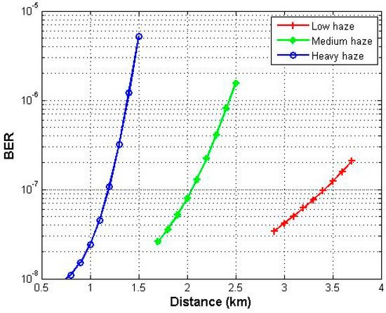 The eye diagram at an FSO range of 9 km is displayed in Figure 6. It shows a larger eye opening which assures the successful transmission of the information data at the receiver. Additionally, the effect of different haze levels on the performance of the proposed FSO model that uses CCIS is studied. As low haze weather causes a lower attenuation coefficient (1.537 dB/km) compared to that of medium (4.285 dB/km) and heavy (10.115 dB/km) hazes weather conditions, the information signal can propagate a longer range under it. Figure 7 shows the BER versus different ranges for our proposed model under different haze levels, and one can observe that at a BER of approximately , the FSO ranges are 3.7 km under low haze, 2.5 km under moderate haze, and 1.5 km under heavy haze. So, as the FSO and the haze level range increase, the BER increases.