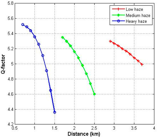 Figure 8 depicts the Q-factor versus the range under different haze levels for the proposed model. As the level of haze become lighter, the propagation range and the Q-factor increase. At a Q-factor of 4.5, the FSO ranges under low haze, moderate haze, and heavy haze are, respectively, 3.7 km, 2.5 km, and 1.5 km.