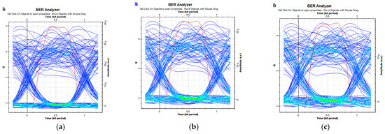 Figure 12 shows the eye diagrams that obtained from the simulation of our proposed model at an FSO range of 3.7 km under low haze, 2.5 km under moderate haze, and 1.5 km under heavy haze. The wider eye opening shows the good reception for the information signal at the receiver.
