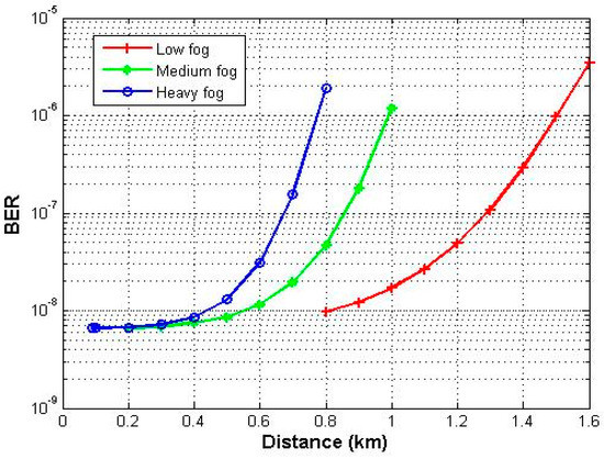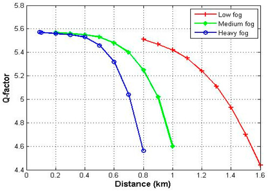 Fog, which is an atmospheric phenomenon that occurs due to suspended smoke particles in the atmosphere, causes a degradation in the information signal during propagation in the FSO channel. Dense fog causes a larger attenuation coefficient than medium fog and low fog. The attenuation coefficients are 9 dB/km for light fog, 16 dB/km for moderate fog, and 22 dB/km for heavy fog. Thus, the performance of our proposed model under different levels of fog conditions are investigated. Figure 10 and Figure 11 show log (BER) and Q-factor, respectively, versus different propagation ranges. As the FSO range increases and the level of fog becomes heavier, the BER increases and the Q-factor decreases. The longer range of 1.6 km is achieved under light fog which is decreased to 1 km under medium fog and further decreased to 0.8 km under heavy fog.