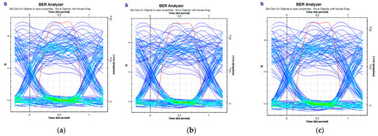 Eye diagrams for the proposed model using CCIS under (a) low haze, (b) medium haze, and (c) heavy haze.