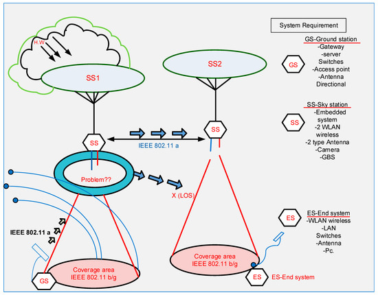 Fiber-wireless (FiWi) communication services are usually provided by terrestrial and satellite systems. The demand for large capacity remote administration is growing, particularly for “last mile” conveyance [21]. Existing methods of telecommunication using satellites and telecommunication towers have several limitations. In isolated areas, the performance of communication systems can be enhanced by utilizing an aerial altitude platform system (AAPS), due to the fact that conventional approaches fail to support full access to the data link in rural and isolated areas [21]. Therefore, the AAPS communication system in rural and remote areas is suggested. This technique causes an acceleration in the adoption of the internet and telecommunications by rural communities. The achievability of the framework will be set up through tests and a field trial. The large-scale arrangement of the created framework can play a significant role in bridging the gap between distant communities that are beyond the reach of current telecommunication. The system diagram of the AAPS in a sky mesh network is shown in Figure 13. The method used for data transmission between the primary part, sky station 1 (SS1), and the base, which, in turn, transmits signals to the second node, sky station 2 (SS2), depends on radio frequency (RF) cycles. In the RF cycle, SS1 is connected to the ground station (GS) via IEEE 802.11a, while in the second phase, SS1 is linked to SS2 through RF, and all nodes provide coverage to the ground by utilizing the IEEE 802.11 b/g standard.