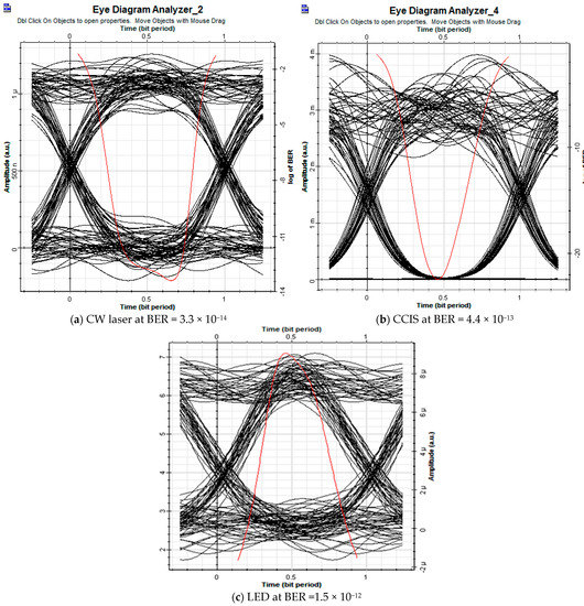 Figure 15 depicts the eye openings for CW laser, LED optical sources, and CCIS-based AAPS-OCDMA systems at 1.25 Gbps data rate with a total of 16 subscribers at 0 dBm received power. The results show that the eye-opening in the CCIS design is quite wide compared to the pure LED-based system, and the eye-opening is less with pure laser. Also, the distance is the main factor that limits performance regardless of the type of optical source. The maximum distance that the proposed system can propagate with BER less than is 6, 38, and 60 km, respectively, when LED, CCIS, and CW laser sources are used. The simulation experiments showed that the CCIS design significantly improves system performance because the combined light source (CW laser + LED) increases the effective transmission power of the first system in proportion to the angle of permittivity of the laser beam received. The possibility of using the FSO system in the sky mesh network based on the CCIS–OCDMA system leads us to our conclusion.