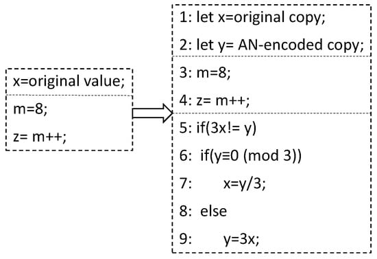 Soft error recovery approaches at the source code level can be classified into duplication-based and checkpoint-based approaches. TRUMP [] is a typical duplication-based approach. Figure 1 shows the recovery pseudo-code of TRUMP. x is the original copy, and y is the AN-encoded copy of x. y and x have a predefined relationship during normal program execution: . An error is detected if the relationship is not satisfied, namely, . In the recovery mechanism, the corrupted copy is inferred by the relationship and is corrected by using the correct copy. The concept of duplication-based approaches is simple; however, many statements are required for insertion into source codes.