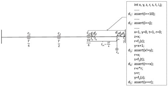 (2) Periodic checkpointing recovery is a popular checkpoint-based approach. It does not require users to modify the program’s source code. A shell script is usually used to launch the checkpoint and recovery operations to save the current state of a process and recover it to a previously stored state. Figure 2 provides an example; , , and are APIs provided by the checkpointing tool Berkeley Lab Checkpoint/Restart (BLCR) [], starts the program execution, launches the checkpoint operation for generating a checkpoint file, and launches the recovery operation to resume the process execution by the checkpoint file. The periodic checkpointing recovery approach does not modify the program codes. However, its time overhead cannot be substantially decreased because it does not consider detector locations when it deploys checkpoints. For example, in Figure 3, T is the program execution time, and the checkpoint interval is . , , and are checkpoints that are set during T. , , ⋯, and are detectors that are executed during the program execution of . The first two detectors have ranges of , and the last three detectors have ranges of . The rectangular box shows the code that is executed during . The five assertion statements represent five detectors, , , ⋯, and . When , , and detect an error, the error recovery time at the recent checkpoint is very long because the program is rolled back to and continues running from . The time of rolling back to is at least equal to the difference between and .