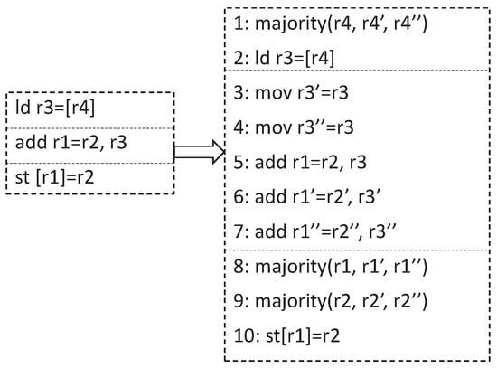 The instruction duplication mechanism at the compiler level recovers programs from soft errors by applying redundant instructions. SWIFT-R [] is a typical instruction duplication approach. It intertwines three copies of the instruction and uses majority voting before critical instructions, such as instructions. Figure 4 presents an example. Before interacting with the memory cells, SWIFT-R determines the accuracy of the data using a 2-of-3 majority voting operation, which is represented by the “majority” function in Figure 4. In line 8, the means that the data in the three registers are set to the majority value. If and , is set to to correct the data in . SWIFT-R performs soft error detection and recovery simultaneously on three copies. The cost of SWIFT-R is high because it adds many redundant instructions. S-SWIFT-R [] is a selective SWIFT-R. It selects different register subsets from the microprocessor register file to be protected rather than protecting all registers. S-SWIFT-R is more flexible than SWIFT-R. However, there are still many redundant instructions in S-SWIFT-R. SWIFT-R and S-SWIFT-R only check the operands before executing critical instructions. They do not protect the result of the critical instructions. NEMESIS [] was developed to improve soft error resilience and reduce the performance overhead. It compares the results rather than the operands of critical instructions. Although many efforts have been made to refine the duplication space, the cost of instruction duplication remains quite high.