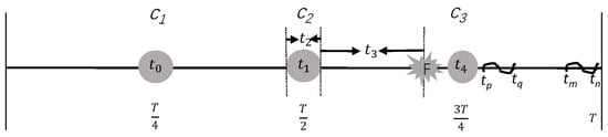 In Figure 10, a checkpoint called is inserted into the middle of . Then, is divided into two parts. The errors detected by the detectors in the second part of is handled by utilizing rather than , changing the recovery time of . The new recovery time of is represented by Equation (6), where A is the recovery time of the historical state, B is the recovery time of the current state, in B is the number of detectors in the first half of . The insertion of also changes the checkpointing time of . The new checkpointing time of is expressed by Equation (7).