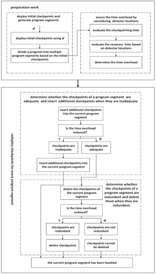 (2) A program is divided into multiple segments using checkpoints. The time overhead of each program segment is determined, including the checkpointing time and recovery time. The change in the time overhead of each program segment is evaluated when checkpoints are inserted or deleted, and the change is used to adjust the checkpoint deployment.