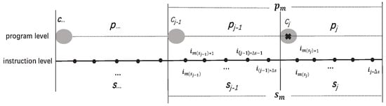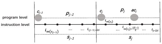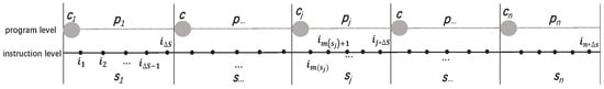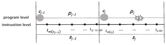 The checkpoints of a program are deployed based on the checkpointing interval of the periodic checkpointing recovery approach. These checkpoints are called initial checkpoints. Then, the program segments are generated based on the initial checkpoints. Figure 7 shows the division of the program segments. At the program level, – are checkpoints. They divide a program into n program segments, –. At the instruction level, the dynamic instructions of the program are also divided into n instruction segments, –. – represents the dynamic instructions, where refers to the number of instructions in every instruction segment. The program execution time between two checkpoints is the same in the periodic checkpointing recovery. Therefore, the instruction segments typically have the same size when dynamic instructions are considered. The instructions of instruction segment are –, where is the number of the first instruction of . The value of is expressed by Equation (1). As shown in Equation (1), is related to the number of instructions in every instruction segment, i.e., and the number of , i.e., j.