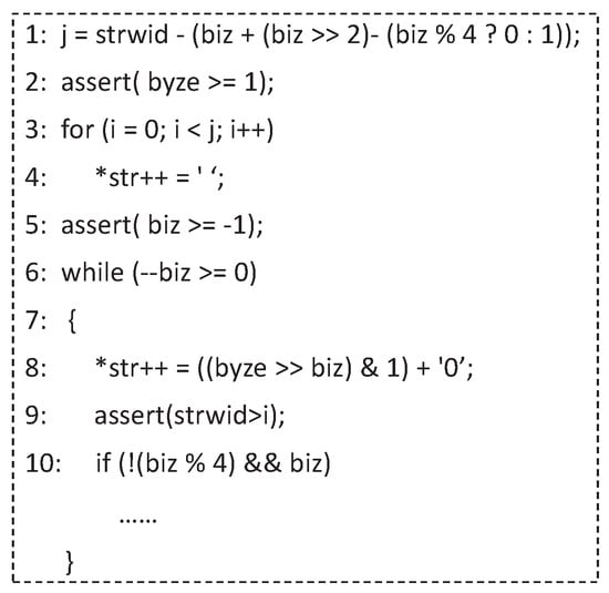 The time overhead of a program segment refers to the handling time of the errors detected by the detectors in the program segment, i.e., the fault tolerance time. Figure 8 presents an example to illustrate the time overhead. It shows the segment “bitstrng” with the detectors, where “bitstrng” is a program in the Mibench benchmark suite that prints a bit pattern of bytes formatted as a string. The detectors are widely applied program invariant assertions and are represented by the assertion statements [,] in lines 2, 5, and 9. In this case, the time overhead of this segment is the handling time of the errors detected by the assertion detectors.