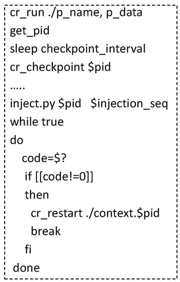 Fault injection is widely used to simulate single-event effects (SEEs) and the resulting soft errors in experiments [,]. Pin is a binary instrumentation framework for the IA-32 and x86-64 instruction sets, enabling the creation of dynamic program analysis tools []. Similar to [,,], Pin was used for fault injection by altering one bit in the register or memory cell from 0 to 1 or from 1 to 0. Besides, Pin was also used to create the dynamic instrument tool that was used for generating dynamic instructions and program segments. The dynamic instrument tool tracks the program execution and divides the program into multiple segments based on the program execution and checkpointing interval. The original program execution time was T. Two independent experiments were performed with different checkpointing intervals of the periodic checkpointing recovery: and . BLCR is a representative system-level checkpointing tool for the Linux platform []. It saves the entire state of a process to disk, such as the process ID, CPU registers and virtual memory, and later restores the state. The BLCR provides instructions to execute checkpoint and recovery operations. A user is only required to execute the instructions but does not have to implement them. We employed BLCR to execute the checkpoint and recovery operations. The platform for the experimental evaluation was Ubuntu 10.04, running on a Dell Workstation with an i7 processor. The pseudo-code of the procedure of checkpoint and recovery operations is shown in Figure 12. , , and are functions provided by the BLCR. First, is used to run a program. An identification number of the process related to the program is obtained. Then, is executed to generate a checkpoint file after a checkpoint interval. Next, a fault is injected into the process. Finally, a while loop is executed. The value of the variable is obtained from the loop. It is not equal to zero when the assertion detector in the program detects and reports an error. In this case, is used to launch a recovery opertion, and is the name of the checkpoint file which is generated by .