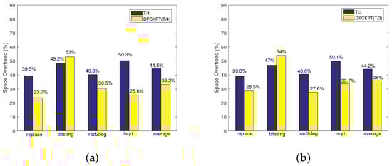 The results of the space overhead are presented in Figure 14. As shown in Figure 14a, the average space overhead was 44.5% for the periodic checkpointing recovery approach with a checkpoint interval of T/4 and 33.2% for DLCKPT. Figure 14b shows that the average space overhead was 44.2% for the periodic checkpointing recovery approach with a checkpoint interval of T/3 and 36% for DLCKPT. The average space overhead was 44.4% (44.5% and 44.2%) for the periodic checkpointing recovery approach and 34.6% (33.2% and 36%) for DLCKPT. Figure 14a,b also show that the space overhead of bitstrng was lower for the periodic checkpointing recovery approach than for DLCKPT. The reason is that DLCKPT did not consider the space overhead when redeploying checkpoints. Thus, the space overhead differed for the different programs. Regardless, the experimental results show that the averaged space overhead across the four programs was slightly lower for DLCKPT than for the periodic checkpointing recovery approach. Figure 14a,b indicate that the space overheads of the two approaches were not very low. The lowest space overhead was 39.3% for the periodic checkpointing recovery approach and 23.7% for DLCKPT. The reason is that the space overhead is related to the data stored in a checkpoint. The lower the data volume of the checkpoint, the lower the space overhead is. Many intermediate data points were generated during the execution of the programs and stored in a checkpoint by the BLCR, resulting in a large checkpointing data volume. The optimization of the space overhead will be considered in a future study.