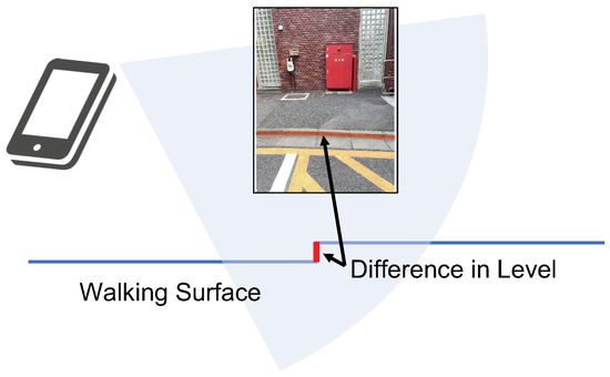 The detection of differences in level on the ground has various possible applications, including walking assistance for blind people, elderly people, factory workers, etc. In an autonomous driving scenario, the detection of differences in level on roads, such as curbs, has already been studied as a fundamental problem in autonomous driving tasks [7,8,9]; however, it relies on rich and large-sized vehicle-mounted sensors, including a camera and a three-dimensional light detection and ranging (3D-LiDAR), which are practically impossible to be mounted on walking people. In this paper, we aim to detect differences in level that exist in all kinds of situations, not only on roadways, but also on factory premises and on sidewalks. These differences in level can be extremely dangerous for blind and elderly people when walking, and pose a serious obstacle to the autonomous robots in our living spaces. Hence, the purpose of this paper is to model the characteristics of differences in level and to detect outdoor differences in level. As shown in Figure 1, we define a difference in level as a region on a walkable surface where the level of the surface changes discontinuously.