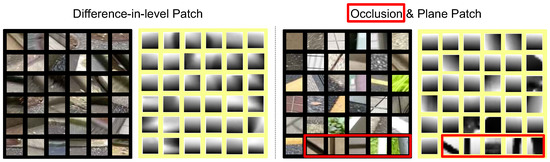 Image patches were extracted from outdoor images taken with an iPhone 12 Pro to create the dataset, and there are two different image patch sizes: and . To ensure that the environment of experimental data was not too single, outdoor images were taken in 45 different scenes. Difference-in-level image patches were extracted from the outdoor images with reference to the differences in level found using the method described in Section 3.1. Occlusion patches were created by detecting edges in the depth image and creating image patches centered on the edge pixels, while plane patches were created by detecting edges in the RGB image and creating image patches centered on the edge pixels. Plane patches with no edges were collected by us. There are 206 occlusion patches, 567 difference-in-level patches, and 643 plane patches in the image patch dataset. Further, there are 204 occlusion patches, 567 difference-in-level patches, and 643 plane patches in the image patch dataset. Examples of the dataset (patch size of ) are shown in Figure 7. The dataset is divided into training, validation, and test datasets at a ratio of 6:2:2.