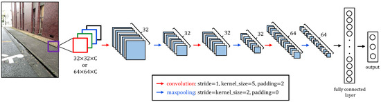 The network has three hidden layers. The number of input channels is arbitrary, but RGB and RGB-D images are used as basic inputs in this paper. Three pairs of convolutional-pooling layers, followed by a Softmax output layer, constitute the architecture of a CNN. There are three outputs, each representing the probability that the patch is one of the three patch types described above. Thus, for example, the patch is considered to contain a difference in level if the probability of being a difference-in-level patch is higher than that of being one of the other two patch types. To compute the network loss, we used a multi-class cross-entropy error function as the loss function. In this study, the use of other models was not considered, because classification accuracy was confirmed to be sufficient with such a simple model, similar to the one used in [31].