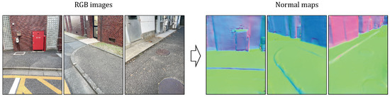 In addition, two points should be noted in the calculation of normal vectors. First, because the camera coordinate system differs if the camera is in a different location, the normal value of the walking plane changes for each camera location if the calculation is performed using the 3D coordinate without modification. Therefore, the camera coordinate system was converted to a world coordinate system with the direction of gravity parallel to the y-axis, and then the normal map was calculated. In addition, the second thing to note is that normal vectors that do not point towards the camera should be flipped to the side of the camera. Figure 9 shows examples of a normal map of a scene taken by the iPhone 12 Pro Max. Thus, as shown in Table 1, the network can receive various combinations of input data.