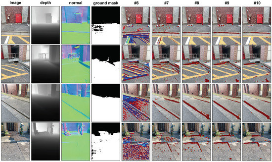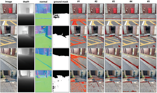 In #4, depth values are added to #3 with respect to the network input. By adding depth values, it is expected that the #4 model will better learn the features of the differences in level than #3. However, looking at the results of #3 and #4, it can be seen that #4 judges the flat part as a difference in level more than #3. This indicates that depth values are not necessarily required for learning differences in level. Finally, the #5 model only uses normal vectors as inputs. Overall, false positives for walls are greatly reduced for #5 compared to #3, which indicates that #5 is better at learning the features of differences in level.