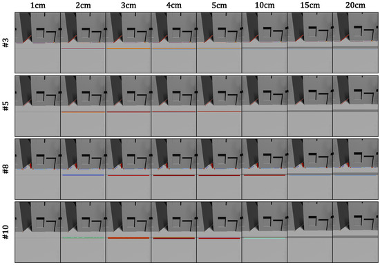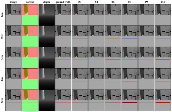 Qualitative results are shown in Figure 14, which shows that the models trained with only normal vectors in #10 and #5 have relatively few false positives; #4, which uses depth values, detects differences in level from 2 cm to 4 cm, although the response is not very strong; and #9, which also uses depth values, does not detect them at all. The results of models #3 and #8, which use the normal and grayscale images as inputs, show that the difference in level can be detected to some extent, but other false detections are significant. Comparing #5 and #10 shows that #10 has little detection of the wall, similar to the results in Section 4.3. Overall, the models trained on image patches are more responsive to detection of differences in level.