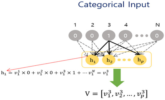 Despite their flexible nature and high prediction accuracy, issues are encountered by methods using autoencoders when processing learner content to generate recommendation data because of the learner’s history. To prevent this, a ground-breaking top-N RS was proposed in [27], which is based on a neural probabilistic language model. The model reduces the sparse-valued input into a fixed authentic-valued embedding vector given by Formula (3):