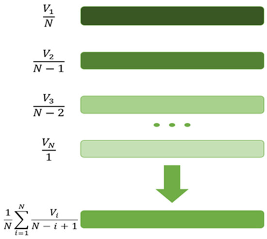 In this case, ‘order’ is the number of courses in the learner’s history, N is the number of courses, and V is the embedding vector of the current course. Equation (6) is used to obtain the average of these vectors following consecutive embedding of objects: