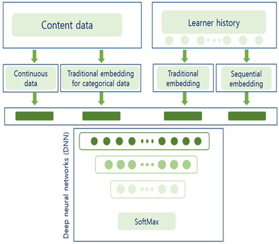 Our dataset comprised the learner’s “jobcode” information, which utilized keywords to describe the learner’s occupation. We calculate the mean vector and concatenate deep networks using these data as an embedding vector input because there are more than 100 job codes, and a single learner could have multiple job codes.