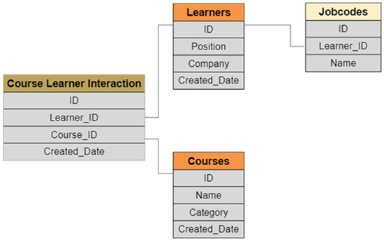 The Korean e-learning platform “www.ubob.com” (accessed on 24 December 2022) provided a dataset to design and implement the recommendation approach. The dataset was primarily used to assess and compare the recommendation approach with other related methods. The dataset structure comprises four tables that contain sequence and heterogeneous information, as illustrated in Figure 5.